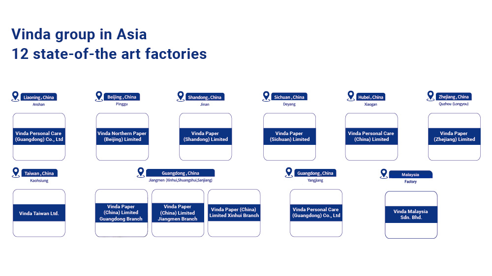 Founded in 1985, Vinda is a large-scale hygiene company in Asia integrating R&D, production and sales. Vinda is committed to the philosophy of “Healthy Lifestyle Starts with Vinda” and has striven to provide high quality hygiene products and services. Today, Vinda has a total of 12 state-of-the-art production bases, and operating core business segments including tissue, incontinence care, feminine care, baby care and professional hygiene solutions.