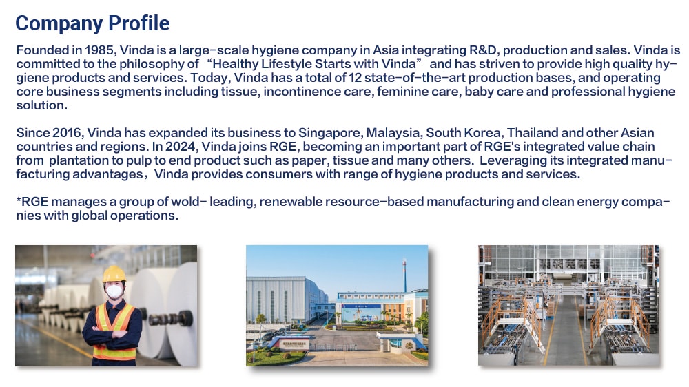 Since 2016, Vinda has expanded its business to Singapore, Malaysia, South Korea, Thailand and other Asian countries and regions. In 2024, Vinda joined RGE, becoming an important part of RGE's integrated value chain from plantation to pulp to end product such as paper, tissue and many others.  Leveraging its integrated manufacturing advantages,Vinda provides consumers with range of hygiene products and services.